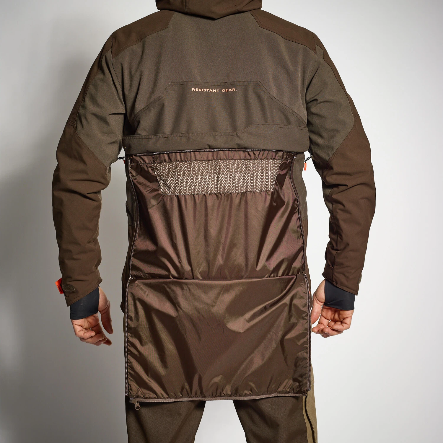 The dog runs, speeds up and freezes. There is a woodcock nearby. If the woodcock dares to show itself, and you are lucky enough to fire as it takes off, we have added a game bag on the back of the jacket, which can be opened and closed on the sides using zips. What’s more, you can easily clean the game bag thanks to the full-length horizontal zip that allows you to open it completely.